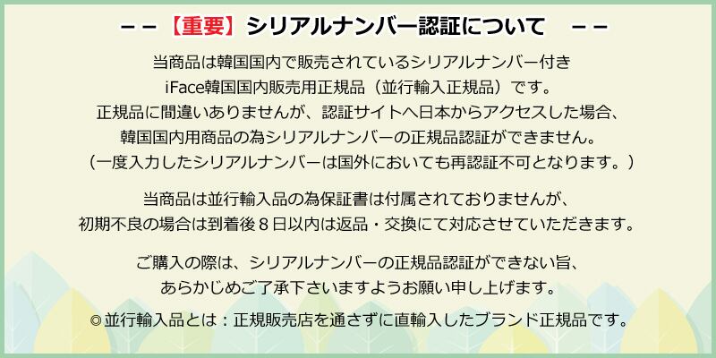 当商品は韓国国内で販売されているHamee社のiFace正規品(並行輸入正規品)ですが、メーカー側の事情による認証システムの変更によりシリアルナンバーについて、正規品認証ができなくなっております。